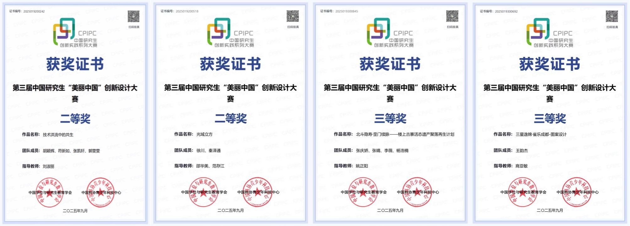 近日,第三届中国研究生“美丽中国”创新设计大赛在哈尔滨举办。由我校服装学院刘淑丽、王式竹、郭海燕老师指导的研究生胡颖辉、符新如、张凯轩、郭雯雯同学的参赛作品《技术洪流中的共生》,荣获全国二等奖;园艺园林学院邵华美老师指导的研究生徐川同学的参赛作品《光域立方》,荣获全国二等奖;园艺园林学院姚正阳老师指导的研究生张庆娇、张晴、李薇、杨浩楠同学的参赛作品《北斗隐寿·歪门续脉——楼上古寨活态遗产聚落再生计划》,荣获全国三等奖;美术与设计学院商亚敏老师指导的研究生王韵杰同学的参赛作品《三星逸锦·雀乐成都-图案设计》,荣获全国三等奖。